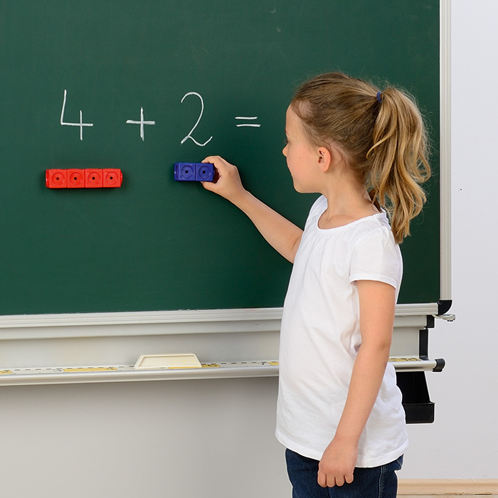Die Würfel lassen sich gut an der Tafel verschieben. Das erleichtert Ihnen, die Riesen-Steckwürfel bei arithmetischen Übungen an der Tafel einzusetzen.