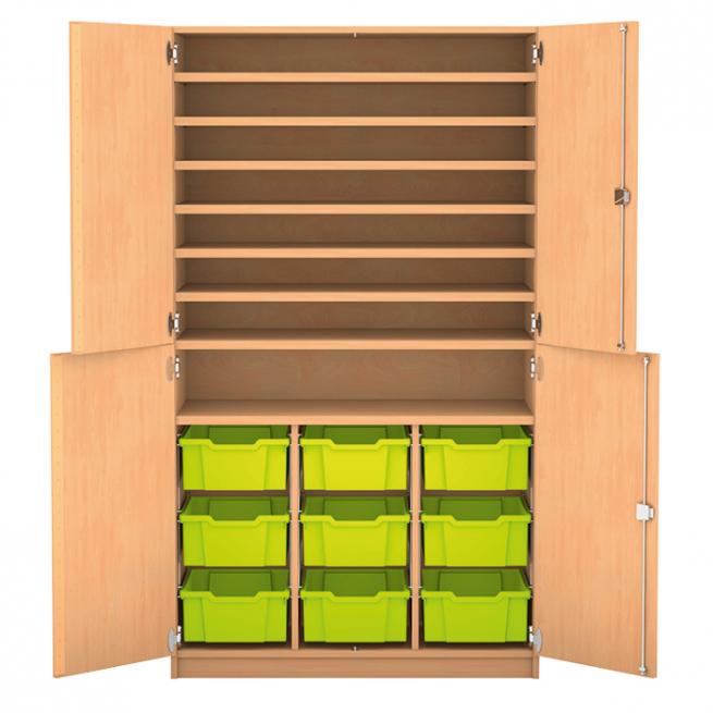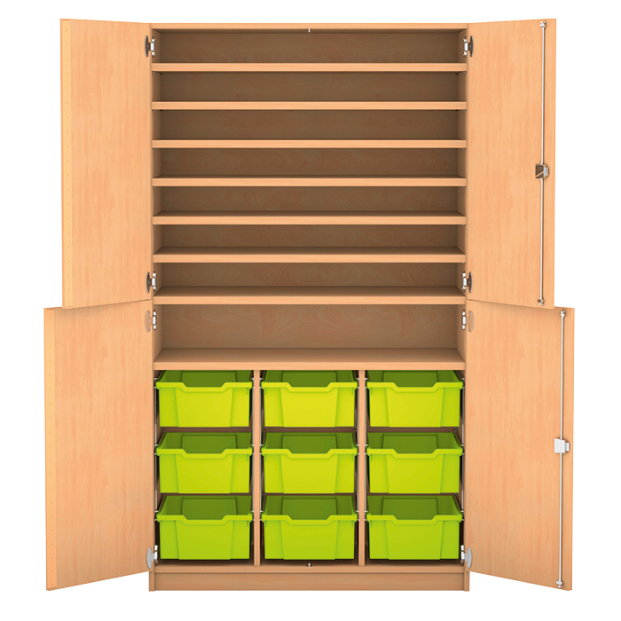 Kunstvolle Ordnung. Papier verstauen Sie knick- und eselsohrenfrei auf den eigens dafür vorgesehenen Böden. Pinsel, Farbe, Scheren, Klebe und alle möglichen Utensilien, die zum Kunst schaffen benötigt werden, finden Platz in den farbigen oder transparenten Gratnells-Boxen. Vor ungewünschtem Zugriff schützen wahlweise 4 Halb- oder 2 hohe Türen.