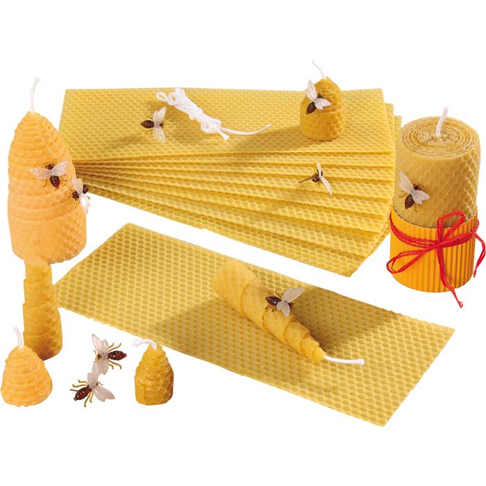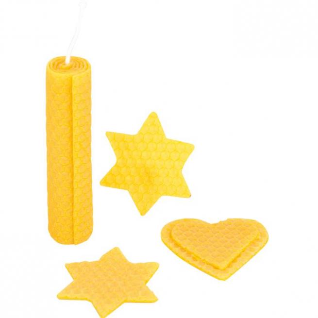 Die Bienenwachs-Platten werden einfach zu Kerzen zusammengerollt. Mit Ausstechformen kreieren Sie z. B. schnell eigenen Baumschmuck. Heimeliger Duft und Anleitung inklusive. Ab 3 Jahren.