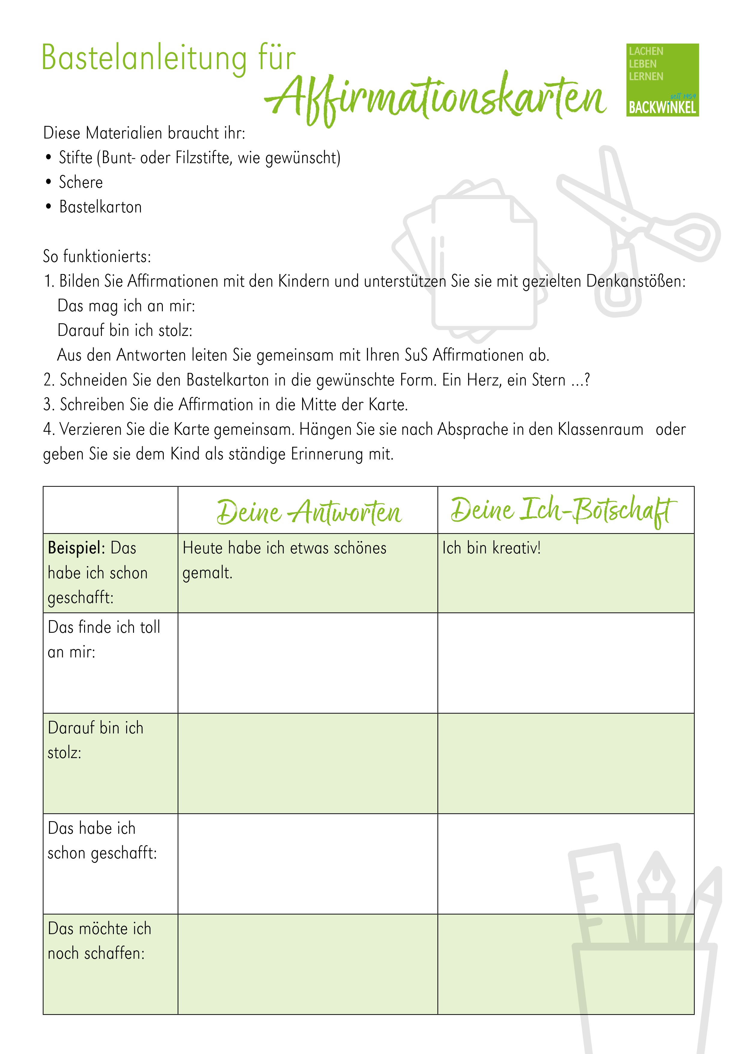 Erarbeiten Sie mit Ihrer Klasse zum Beispiel Affirmationen, die Sie gemeinsam auf kunstvoll gestaltete Karten schreiben. Um Ihre Schülerinnen und Schüler dabei zu unterstützen, haben wir Ihnen eine Anleitung als kostenlosen Download zusammengestellt. Um die Kinder dabei zu unterstützen, Affirmationen zu bilden, die wirklich hilfreich und persönlich sind, bietet es sich an, mit Vorlagen zu arbeiten, die den Gedankenprozess der Kinder anstößt. Für den Bastelspaß brauchen Sie nichts weiter, als Bastelkarton, ein paar Farben und die ein oder andere Verzierung.