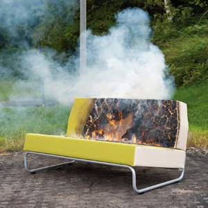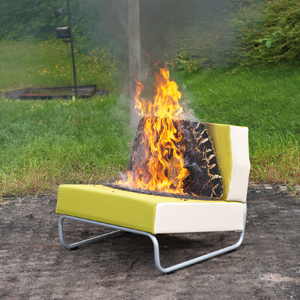 Bezugsstoff und Schaumkern haben keine Brandschutzeigenschaften. Das Möbelstück brennt sofort unter starker Rauchentwicklung.