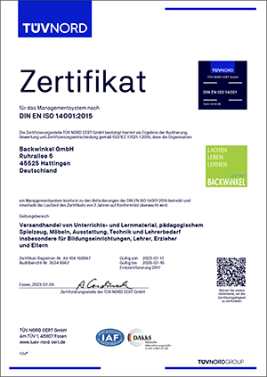 Nachhaltig LACHEN LEBEN LERNEN – dafür achten wir auf ökologische Produkte, haben unsere umweltrelevanten Abläufe freiwillig einer Prüfung unterziehen lassen und sind zertifiziert worden. Selbstverständlich sind wir dem dualen System angeschlossen, recyceln unsere Verkaufsverpackungen, versenden unsere Kataloge und Pakete CO2-neutral und lassen unsere Kataloge ebenfalls klimaneutral drucken. Das Papier dafür beziehen wir aus nachweislich verantwortungsvollen Quellen. Neben dem Hauptkatalog für den Kindergarten planen wir all unsere Hauptkataloge künftig auf Papier zu drucken, das zusätzlich mit dem Umweltzeichen „Blauer Engel“ ausgezeichnet ist. Unseren Onlineshop betreiben wir CO2-bilanziert mit Klimaschutzbeitrag.