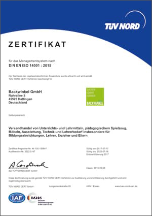 Seit 2017 sind wir auch nach dem weltweit akzeptierten und anerkannten Standard für Umweltmanagement-Systeme zertifiziert. Damit dokumentieren wir nachweislich, dass wir