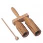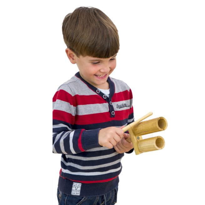 Mit 2 unterschiedlichen Klängen beim Anschlagen. Auf der geriffelten Fläche spielen Sie wie auf einem Guiro.