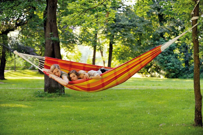 Diese farbenfrohen Hängematten sind besonders breit. Daher bieten sie viel Platz. Auch für mehrere Kinder zum Träumen und Entspannen. Eine gern benutzte Rückzugsmöglichkeit.