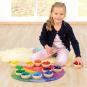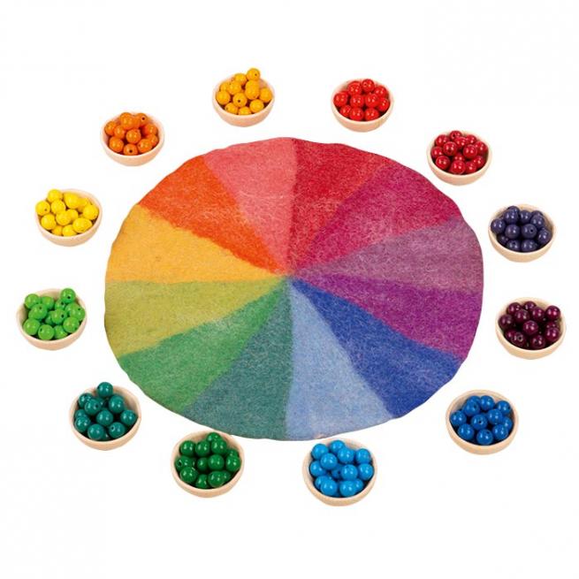 Zum Lernen der Farben sortieren Ihre Kinder die farbigen Holzperlen in die 12 Holzschälchen und positionieren diese dann auf die entsprechenden Felder des extradicken Filzkreises.