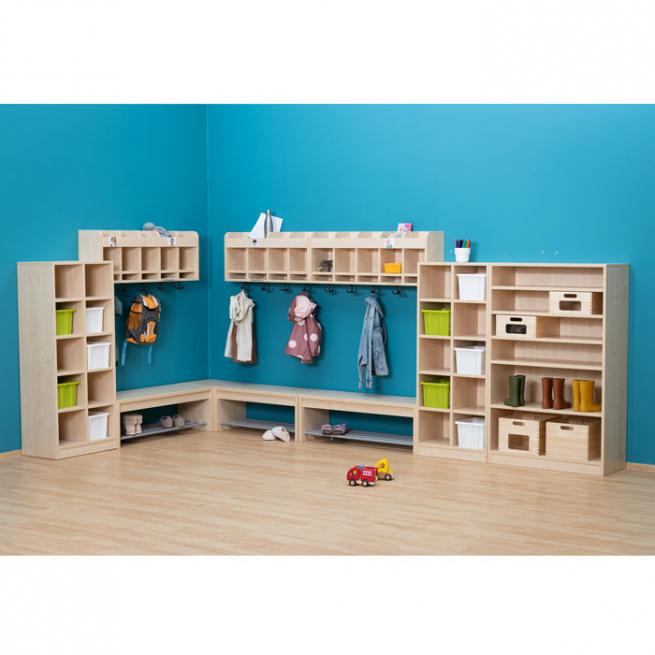 Die Regale sind in 2 Höhen sowie 3 Fachbreiten erhältlich und die Sitzbänke in 4 Breiten sowie 5 Sitzhöhen. So gestalten Sie Garderoben für Kinder im Krippen- bis Grundschulalter. Ihre individuelle Note wählen Sie aus 12 schicken Dekoren.