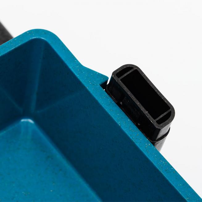 Das Biokunststoffgranulat aus Holz ist eine nachhaltige Alternative zu herkömmlichem Kunststoff. Produziert wird das Material umweltfreundlich in Deutschland, wobei auf die Nutzung fossiler Ressourcen verzichtet wird.