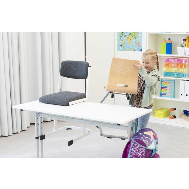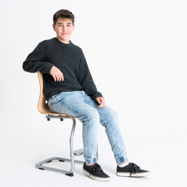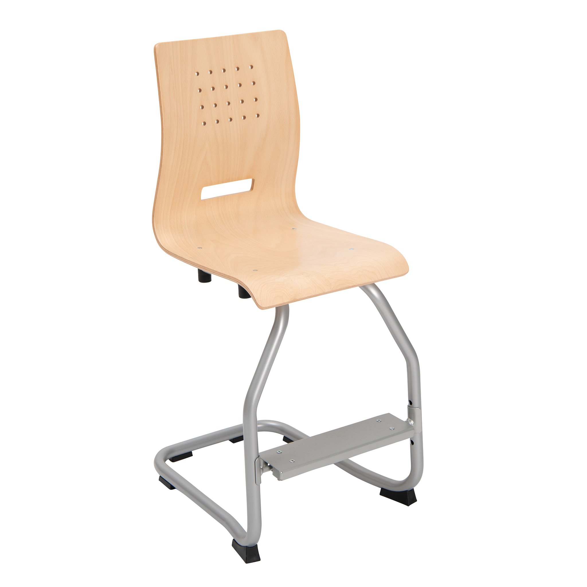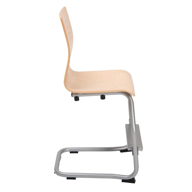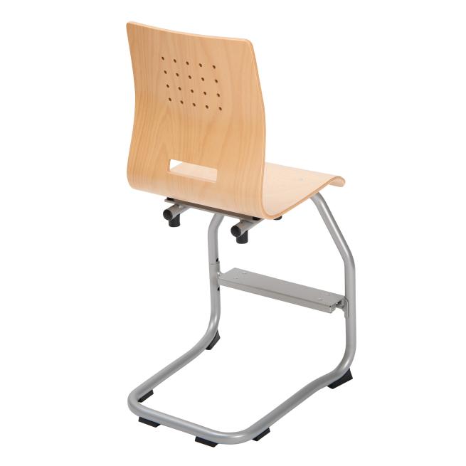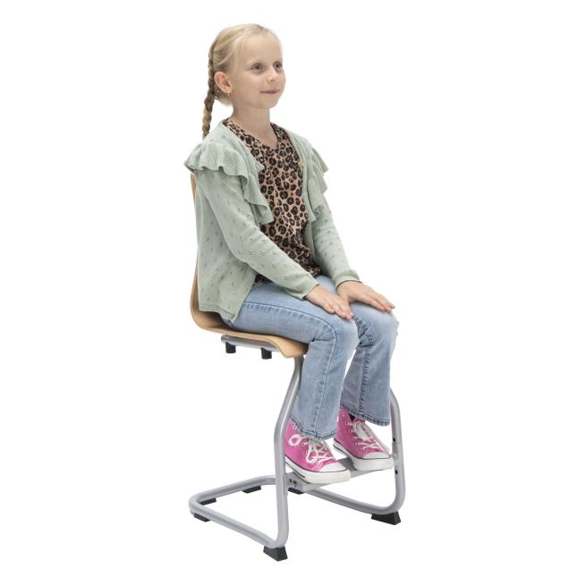 Praktischer Freischwingerstuhl für jüngere und ältere Kinder. Dank beigefügter, 3-fach höhenverstellbarer Fußraste sitzen alle Kinder auf der gleichen Höhe. Somit ist der Stuhl auch einfach jahrgangsübergreifend nutzbar. Auf der ergonomisch geformten Sitzfläche mit Wasserfallkante sitzen alle bequem. Die 20 Designlöcher sorgen für eine moderne Optik und angenehme Belüftung. Die angenieteten Fußkappen schonen den Boden und der vordere Kippschutz bietet festen Stand. Gestell und Schale sind 4-fach mit selbstsichernden Schrauben (M6 x 40) mit M3-Beschichtung mit speziellen Distanzstücken verschraubt. Stapelbar und platzsparend lagerbar.