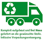 Unsere Flexeo®-Möbel werden an Ihrer gewünschten Verwendungsstelle aufgebaut. Die fachgerechte Verpackungsentsorgung zum Wohle des Umwelt- und Klimaschutzes ist dabei inklusive. Achten Sie auf den grünen LKW.