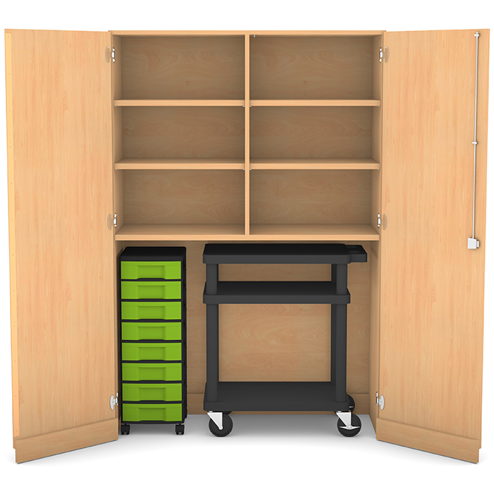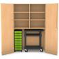 Die Schränke sind zweitürig mit Drehstangenschloss und verstellbaren Böden im Oberteil. Dank der hochwertigen Bauweise mit 19 mm starker Rückwand und der dicken Regalböden stehen die Garagenschränke enorm stabil auf dem Boden. Die Container und Wagen schieben Sie einfach aus dem Schrank direkt in den Klassenraum.