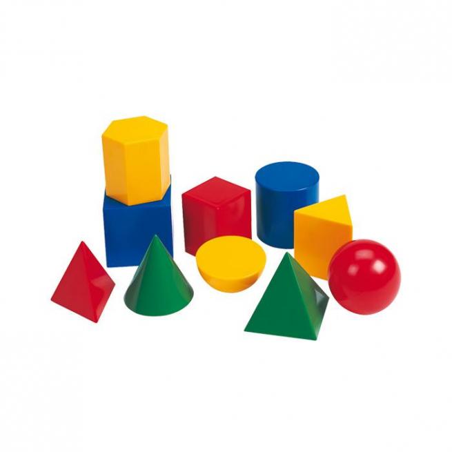 Würfel, Zylinder, Kegel, Quader, Kugel, Halbkugel, Sechseck-Prisma, Dreieck-Prisma, Dreieck-Pyramide und Quadrat-Pyramide