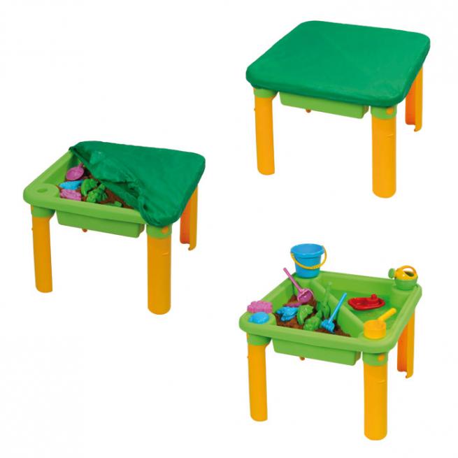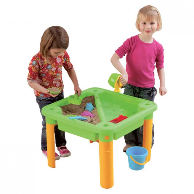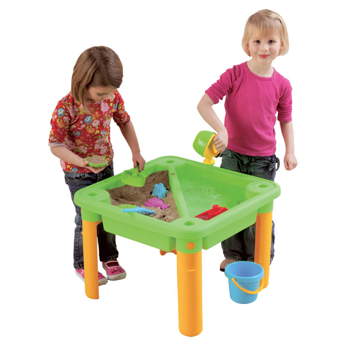 Dieser Tisch bietet eine Fläche für Sand- und Wasserspiele im Stehen. Die Kinder können die beiden Elemente auf diese Weise ausgiebig kennenlernen und ausprobieren. Das Spieltisch-Set wird zusammen mit Sandspielzeug geliefert. Es kann also direkt losgehen! Jede Seite mit Ventil zum Ablassen des Wassers.