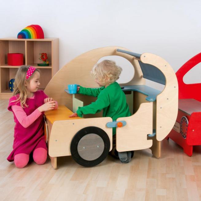 Ob einzeln auf dem Campingplatz oder zusammen mit dem roten Auto für die Fahrt ins Grüne – der Wohnwagenanhänger sorgt für Urlaubsstimmung. Beides lässt sich sogar mit der beigefügten Anhängestange verbinden. Durch die Tür mit Riegel steigen die Passagiere ein und nehmen Platz in der integrierten Küche. Darin lässt es sich bestens gemeinsam kochen. Die Herdplatte wird per Drehknopf bedient und die Unterschränke bieten genügend Platz für alle möglichen Utensilien. Das Verdeck aus Stoff rundet die Ausstattung ab. Mit Anhängestange.