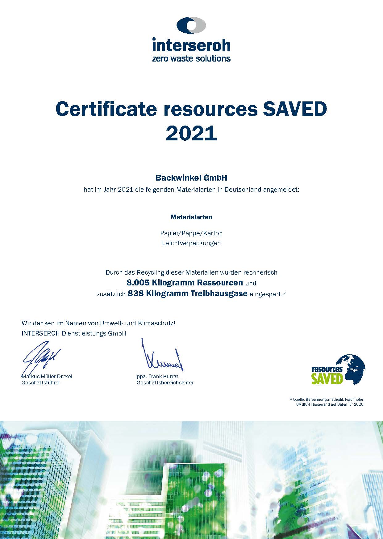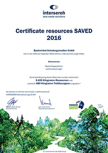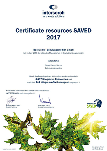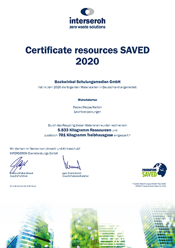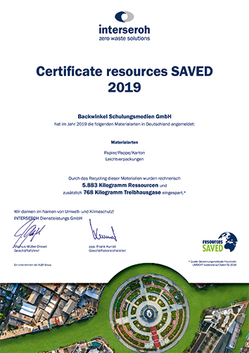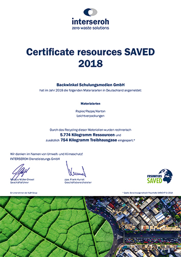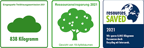 Wir melden jährlich Papier, Pappe, Karton sowie Leichtverpackungen zum Recycling an und erhalten das Zertifikat über die eingesparten Ressourcen sowie Treibhausgase. 2021 haben wir z. B. 8.005 kg Ressourcen und zusätzlich 838 kg Treibhausgase eingespart.