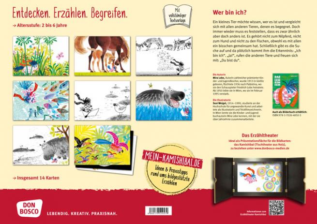 Lange Ohren hab ich, aber ein Hase bin ich nicht. Meine Mähne ist voll, mein Schweif schön bauschig, aber ein Pferd bin ich nicht. Hm, überlegt das kleine Tier, wer bin ich denn eigentlich? Auf der Suche nach einer Antwort auf diese wichtige Frage, begegnet das kleine bunte Tierchen einer ganzen Reihe anderer Tiere. Mit allen fühlt es sich ein bisschen verwandt, obwohl es doch ganz anders ist. Wie das kleine Tier plötzlich sich selbst erkennt und versteht, dass es keinen Sinn ergibt, sich mit anderen zu vergleichen und wie sehr sich auch die anderen Tiere mit ihm darüber freuen, erfahren die Kinder anhand dieser rührenden Geschichte im Kamishibai.