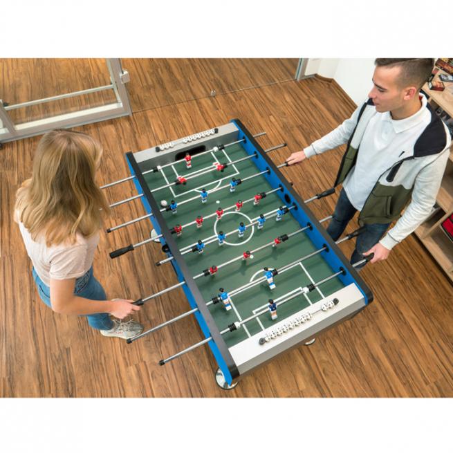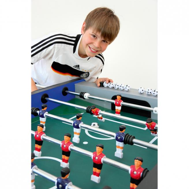 Ob Sie ein Mannschaftsturnier veranstalten oder die Pausenzeit beleben möchten: Dieser Kicker-Tisch ist das ideale Spiel- und Sportgerät für den Fußballspaß, zu zweit oder als Gruppe. Der kompakte Unterbau sorgt für einen sicheren Stand – auch bei hitzigen Partien! Alle Kanten des äußerst robusten Korpus sind abgerundet. Mit seinen breiten und einzeln höhenverstellbaren Füßen passt sich der Tisch jeder Bodenfläche an. Die Führung der Spielstangen überträgt durch extraleichtläufige Kugellager schnelle Reaktionen direkt auf das Spiel.
