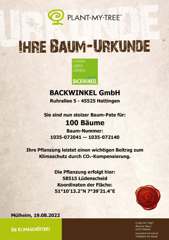 Wir als BACKWINKEL kehren nicht nur durch CO2-Kompensation, Recycling und Ökostrom vor unserer eigenen Haustür. Wir schützen das Klima zudem aktiv, indem wir uns fürs Pflanzen neuer Bäume entschieden haben – hier bei uns in NRW und auch in Afrika. Um dieses Ziel zu realisieren, sind wir nun Klimaschutzpartner von PLANT-MY-TREE® und FRUITFUL OFFICE.