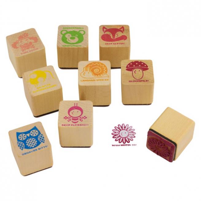 9 Motivations-Stempel aus Holz, L x B x H je Stempel: 3 x 3 x 3,5 cm