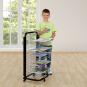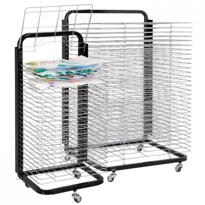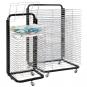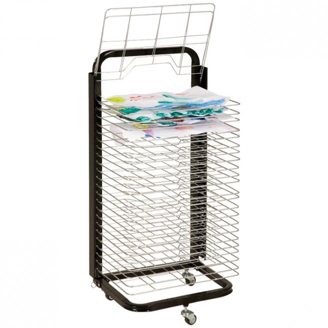 Auf den klappbaren Böden des Gestells aus Metall trocknen bis zu 25 Kunstwerke bis zu einer Größe von DIN A3. Dank der 3 Rollen bewegen Sie das Gestell leicht von A nach B. Der Abstand zwischen den Drahtböden beträgt zwischen 2 -3 cm, ein integrierter Federmechanismus gibt ein wenig nach. Die Böden sind fest montiert und können nur geklappt, nicht herausgenommen werden.