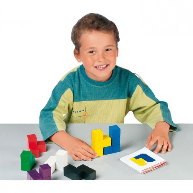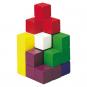 27 Holzwürfel sind zu 7 spektralfarbigen, unterschiedlich geformten Bauelementen zusammengefügt. Aus diesen Holzelementen gestalten ihre Schüler viele schöne Figuren.