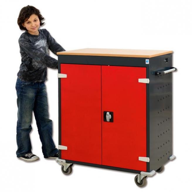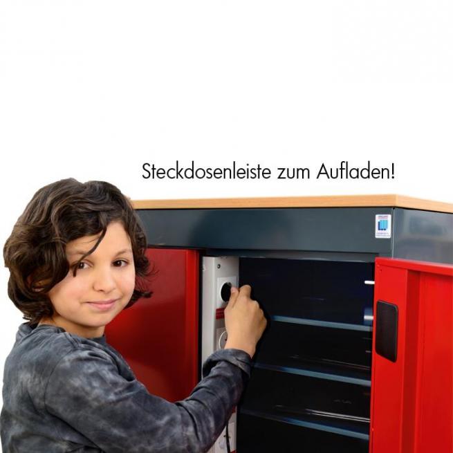 Im Wagen laden Sie 16 Notebooks gleichzeitig auf. Zum Schutz des Stromnetzes werden die Geräte über einen Einschaltstrombegrenzer geschaltet. Er verhindert, dass beim Einschalten zu viel Strom gezogen wird und dadurch ggf. die Sicherung herausfliegt. Der Wagen hat außen einen Stromanschluss mit Generalschalter. Das 5 m lange Kabel ist für den einfacheren Transport abnehmbar.