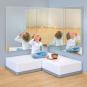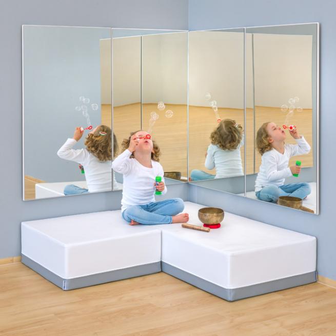 Das neutrale Weiß lenkt die Kinder nicht ab. So richten sie ihre Aufmerksamkeit ganz auf ihre Sinne. Fördern Sie z. B. mit farbigen Lichtquellen und Chiffontüchern die audiovisuelle Wahrnehmung. Mit Klangschalen oder Musik regen Sie die auditive Wahrnehmung an. Auch die Wandspiegel aus Sicherheitsglas tragen dazu bei und stärken dazu noch die kindliche Selbstwahrnehmung.