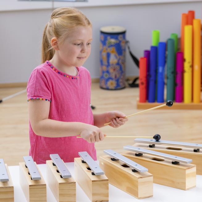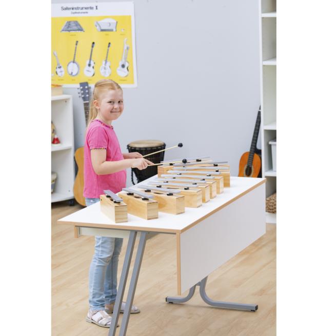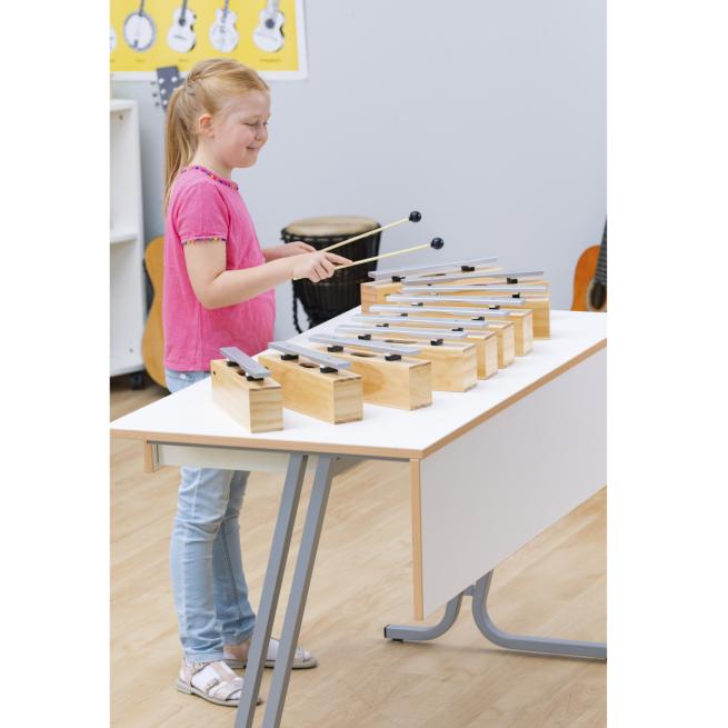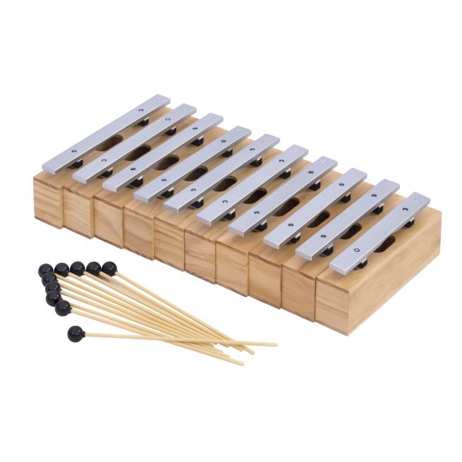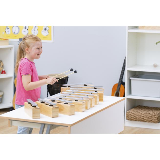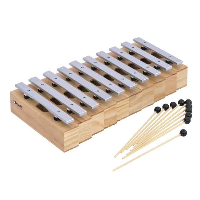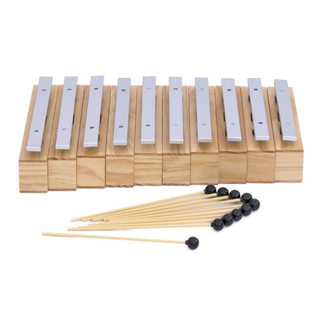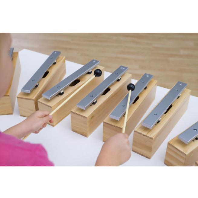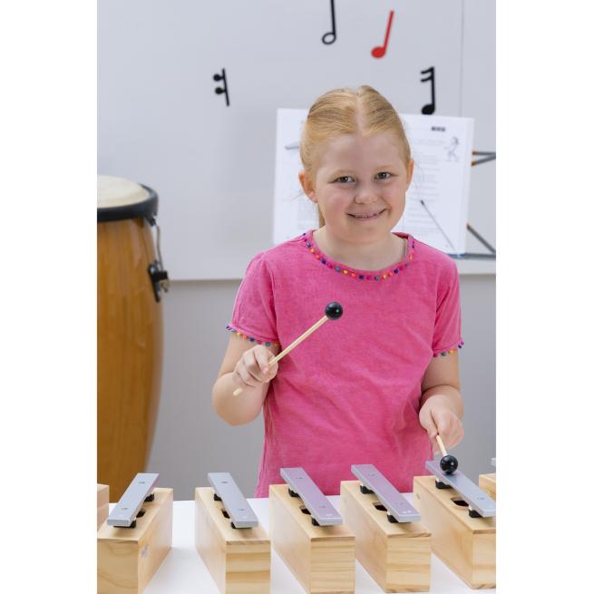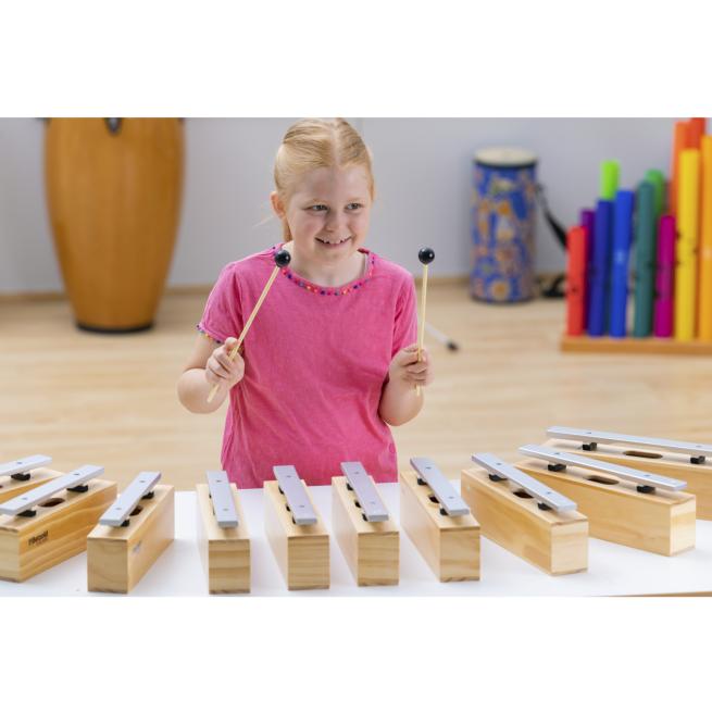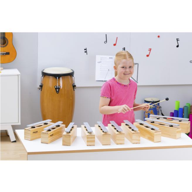Die Resonanzkästen aus Kiefernholz bieten in Verbindung mit den Klangstäben aus Leichtmetall beste Klangeigenschaften bei einem hervorragenden Preis-Leistungs-Verhältnis. Der Gruppensatz besteht aus 10 Bausteinen und 10 Schlägeln komplett aus Kunststoff mit einem weichen, kugelförmigen Kopf.