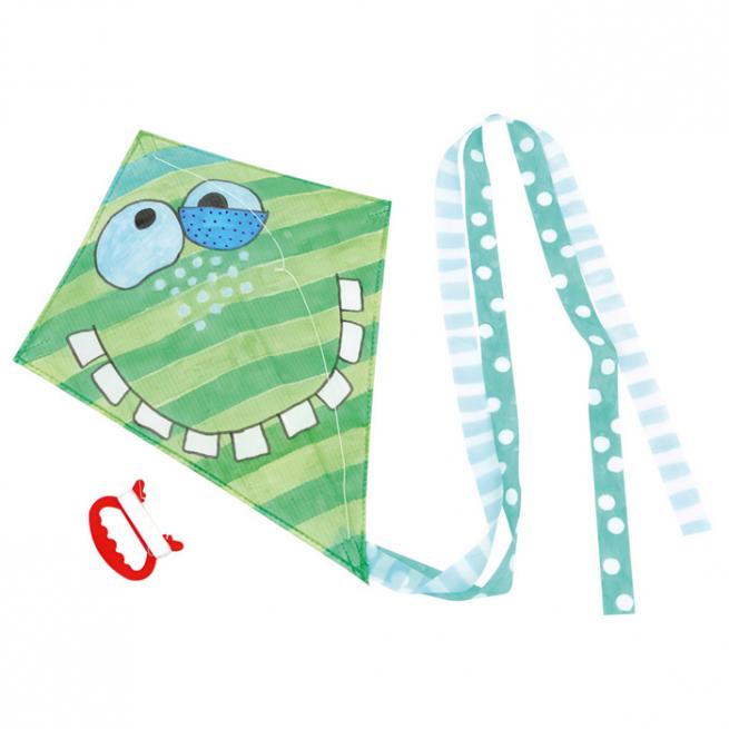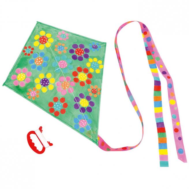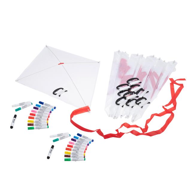 10 Blanko-Drachen (H x B: 72 x 60 cm, aus 100 % Polyester, je mit 25 m Nylonschnur und Handspule)20 Stoffmalstifte (jede Farbe 2x)