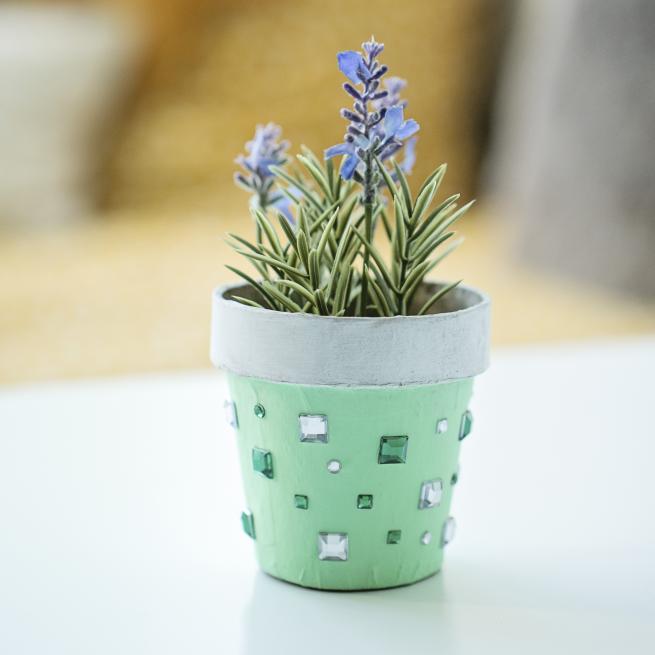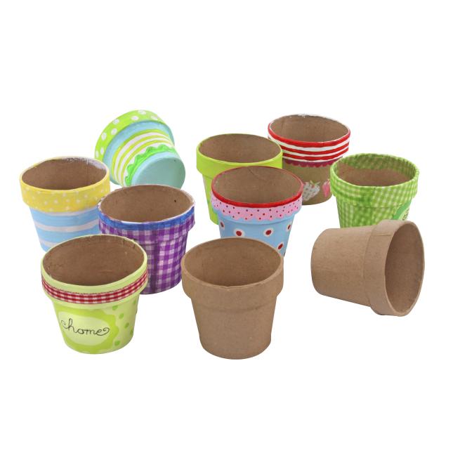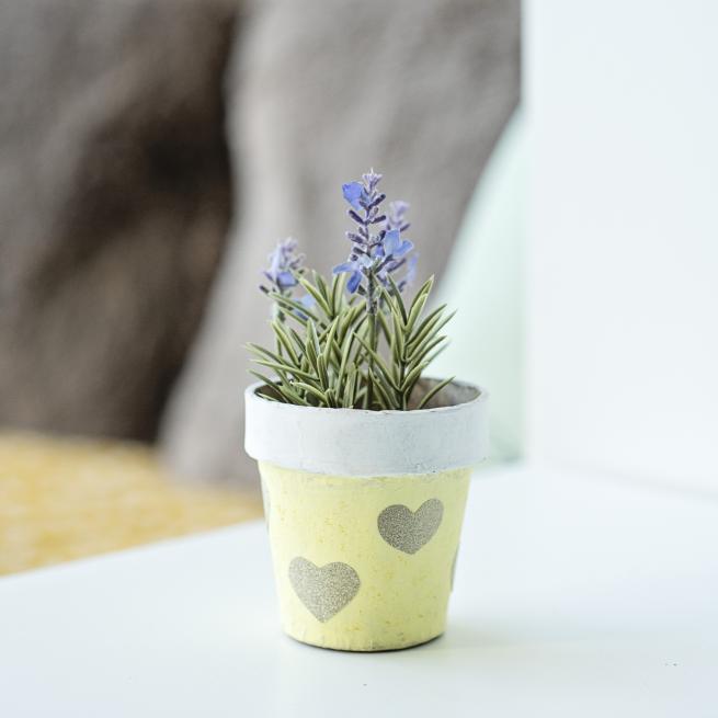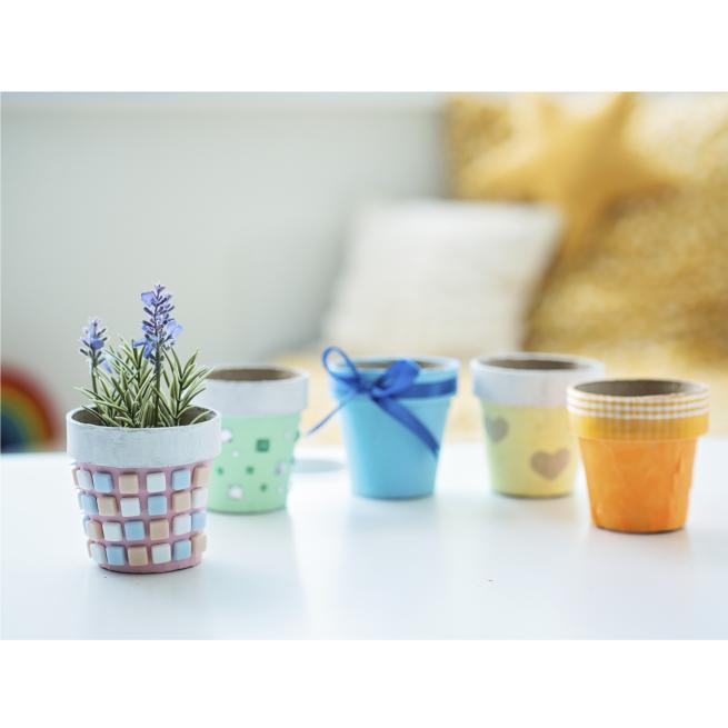 Die Kinder gestalten die Blumentöpfe selbst – perfekt als Muttertags-Geschenk. Wenn in die Blumentöpfe etwas eingepflanzt werden soll, füllen Sie die Erde einfach in einen kleinen Joghurtbecher. So bleibt das Papptöpfchen geschützt und Blumen oder Samen können prächtig gedeihen.