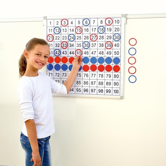 Der Zahlenraum bis 100 wird für die Kinder auf einen Blick vorstellbar. Die mitgelieferten Wenderinge und Wendeplättchen erleichtern eine Vielzahl der Lernschritte.