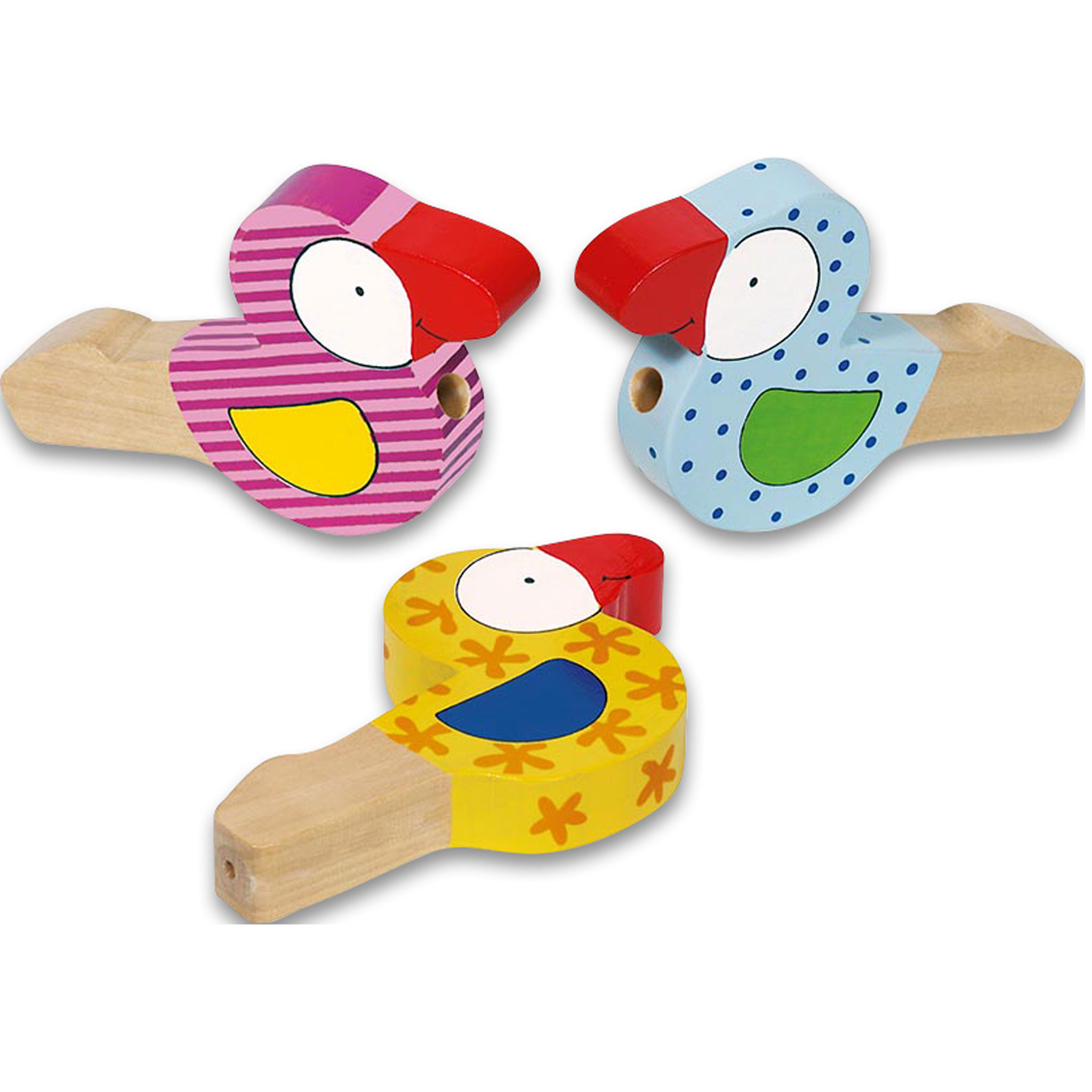 Mit diesen klangstarken Einlautinstrumenten können schon die Kleinen erste Töne machen. Dabei trainieren sie gleichzeitig die Mundmotorik. Die farbenfrohen Vogeltröten aus robustem Holz sind auch ideal als kleines Geschenk.