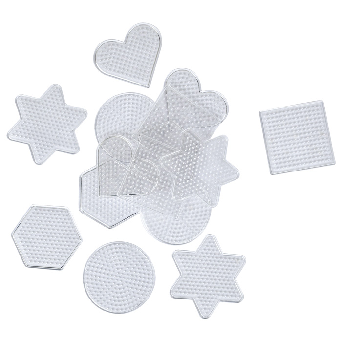 Steckplatten für Midi-Bügelperlen mit verschiedenen Motiven. Je 3x die Motive Herz, Stern, Kreis, Sechseck und Quadrat.