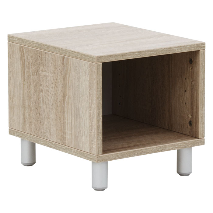 Passende Regale zur einfachen Selbstmontage. Korpus aus robuster Spanplatte im Dekor Eiche mit Stellfüßen in Aluminium.