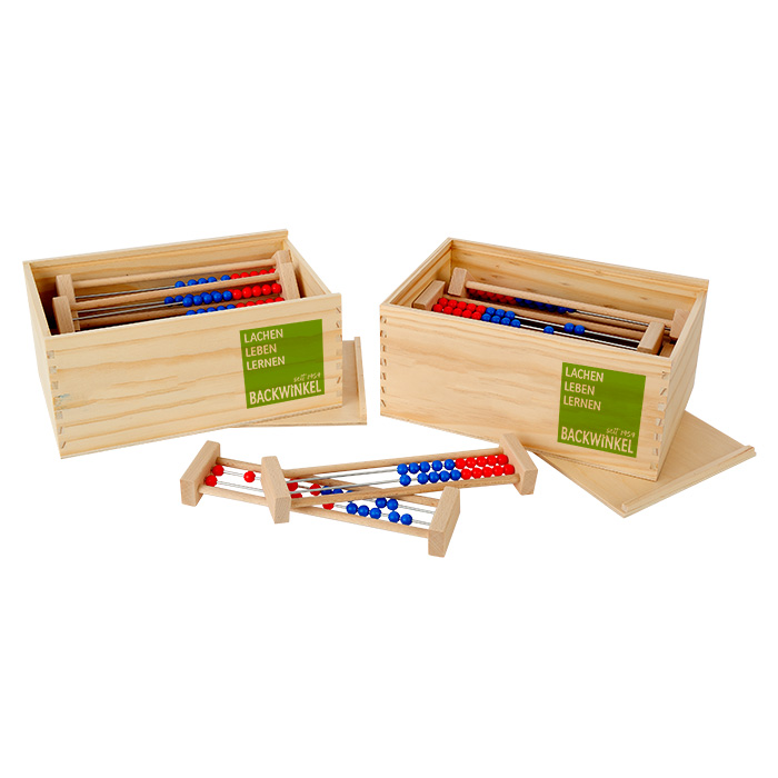 20x den 20er-Rechenrahmen, verpackt in 2 BACKWINKEL-Holzboxen mit Schiebedeckel