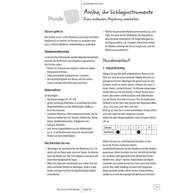 begleiten; zu Musik malen, schreiben, tanzen; Hörerlebnisse besprechen; mit Körper und Orff-Instrumenten Klänge und Rhythmen erzeugen. Die fertig ausgearbeiteten Stunden sind sofort einsetzbar. Auch für fachfremd Unterrichtende umzusetzen. Alle benötigten Materialien finden Sie im Buch oder auf der beiliegenden CD.