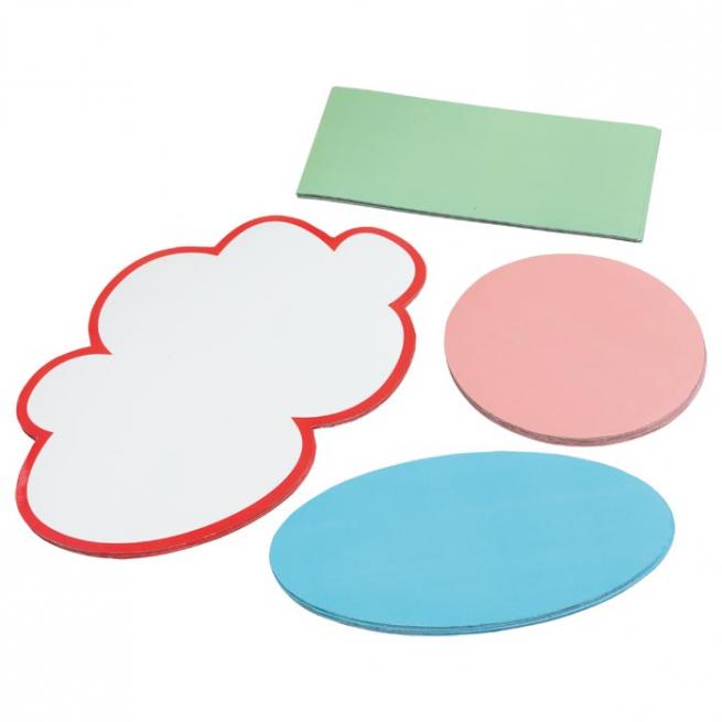 6x Rechteck (20 x 10 cm) z. B. für inhaltliche Details • 6x Kreis (Ø 14 cm) z. B. für Nummerierungen oder Symbole • 6x Oval (20 x 11 cm) z. B. für Zwischenüberschriften • 4x Wolke (28,3 x 17,6 cm) z. B. für Überlegungen
