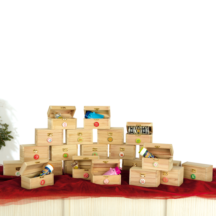 Der Adventskalender besteht aus 24 kleinen Schatzkisten aus Holz. Gestalten Sie die Schatzkisten ganz individuell nach Ihren Vorstellungen, egal ob bunt bemalt, mit großen oder kleinen Zahlen von 1 - 24 beschrieben, die Kisten werden in der Adventszeit garantiert zum Highlight.