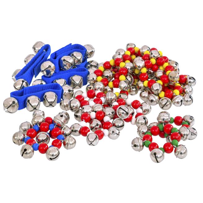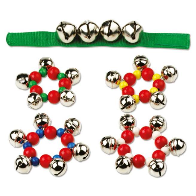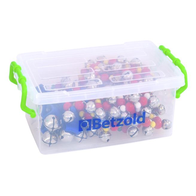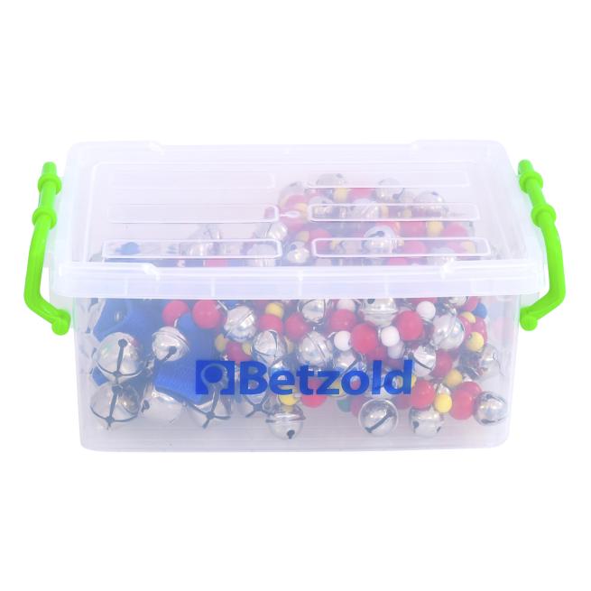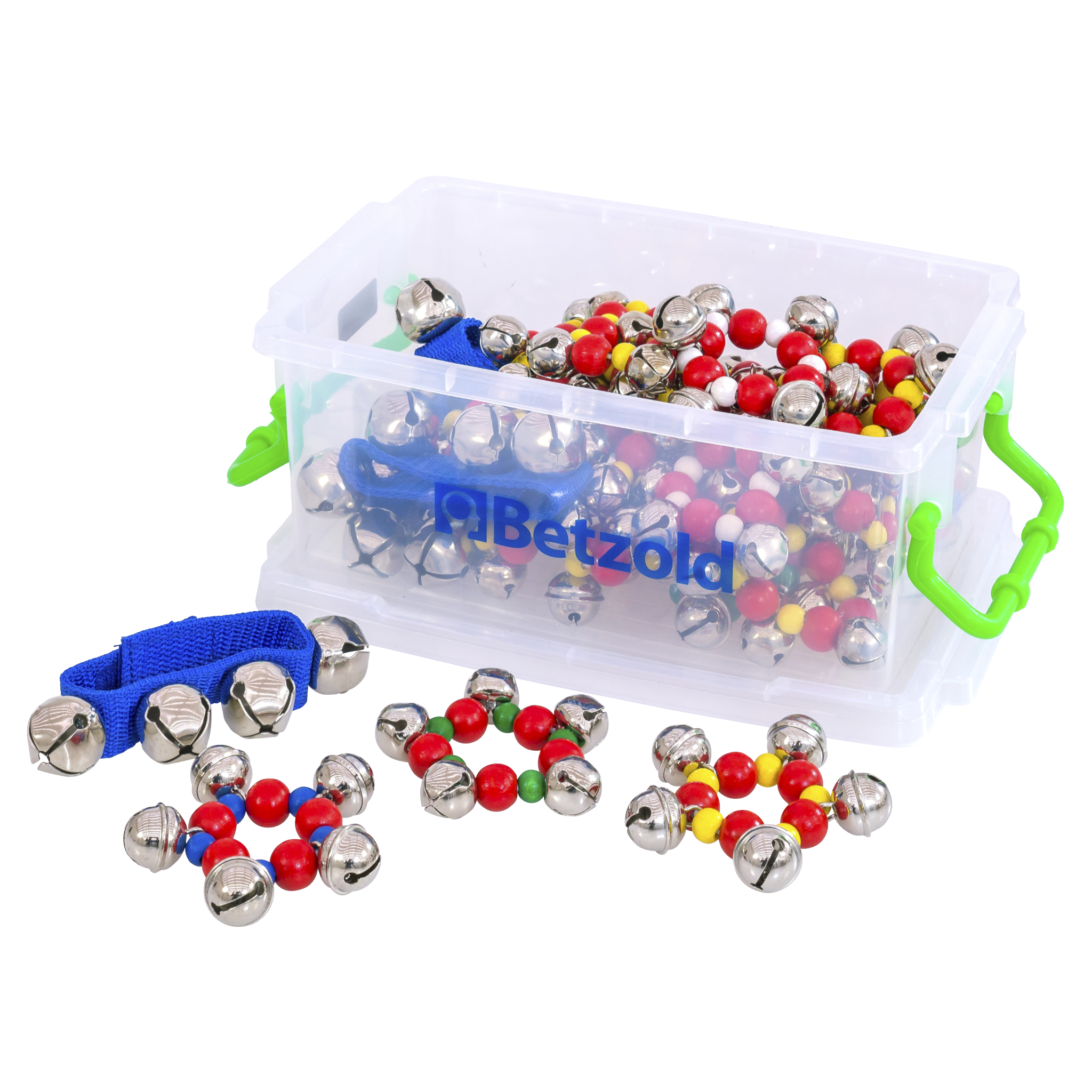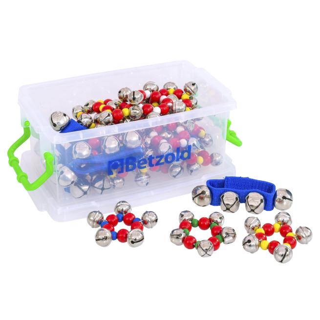 Sie erhalten insgesamt 25 Arm- und Fußreifen mit verschiedenen Schellen und Glocken. Das gesamte Set findet Platz in der praktischen Stapelbox aus transparentem Kunststoff mit Klemmdeckel und Tragegriffen. Die großen bunten Perlen der Armreifen machen das Überstreifen ganz leicht. Auch die Fußreifen sind dank Klettverschlüssen schnell umgelegt. Und schon geht es los. Da haben alle Spaß an Bewegung!
