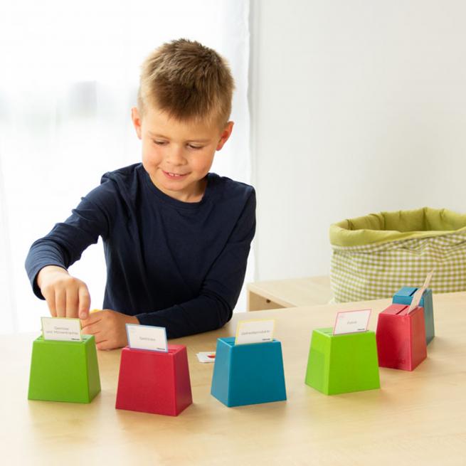 Die Aufgabenkarte einfach oben sichtbar einstecken und entsprechend passende Bildkarten im Becherquizzer sammeln (bitte separat bestellen).