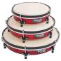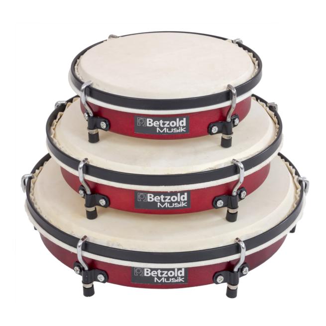 Die 3 Trommeln mit unterschiedlichen Durchmessern bieten vielfältige Anwendungsmöglichkeiten. Der Spieler schlägt den Rhythmus mit der Hand oder mit Schlägeln. Hält der Spieler die Trommel in der Hand, kann er mit den Fingern auf dem Fell den Sound dämpfen. Zum freihändigen Einsatz stellt der Spieler die Trommel auf den Tisch oder den Boden. Das jeweilige Material des Untergrunds bestimmt wesentlich den Klang. Probieren Sie mit Ihren Schülern aus, wie unterschiedlich Holz, Stein oder Teppich den Sound beeinflussen. Das Trommel-Set benutzen 3 Kinder gleichzeitig, oder es dient einem Spieler als Schlagzeug. Sie stimmen die Schlagfelle mit stabilen Spannreifen und Stellschrauben.