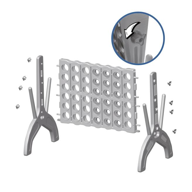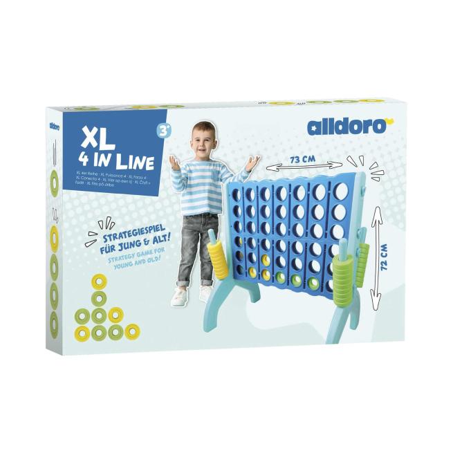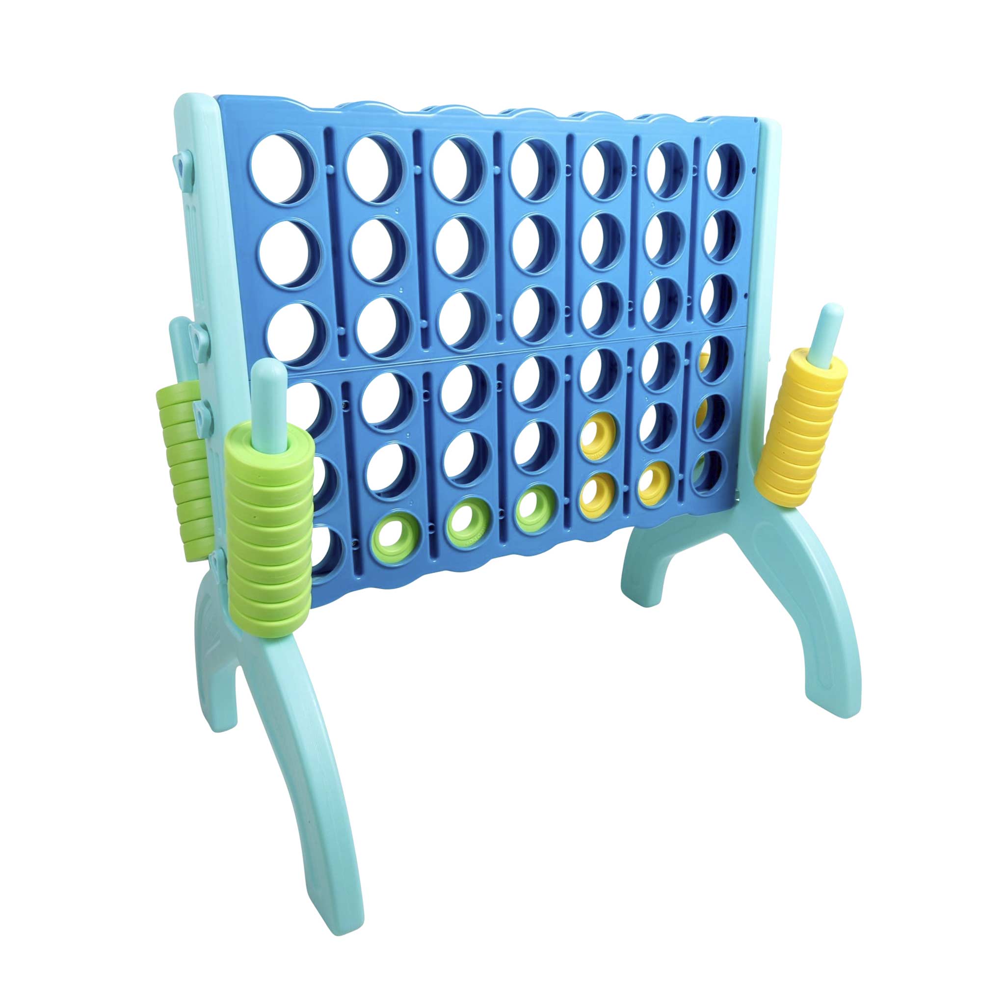 Standfester Spiel-Klassiker für drinnen und draußen. An dem farbenfrohen Gestell taktieren zwei oder mehr Mitspieler die richtige Strategie zum Platzieren der Ringe, sodass vier Ringe derselben Farbe eine waagrechte, senkrechte oder diagonale Reihe ergeben. Platzsparende Aufbewahrung der Spielringe auf den seitlichen vier Füßen.