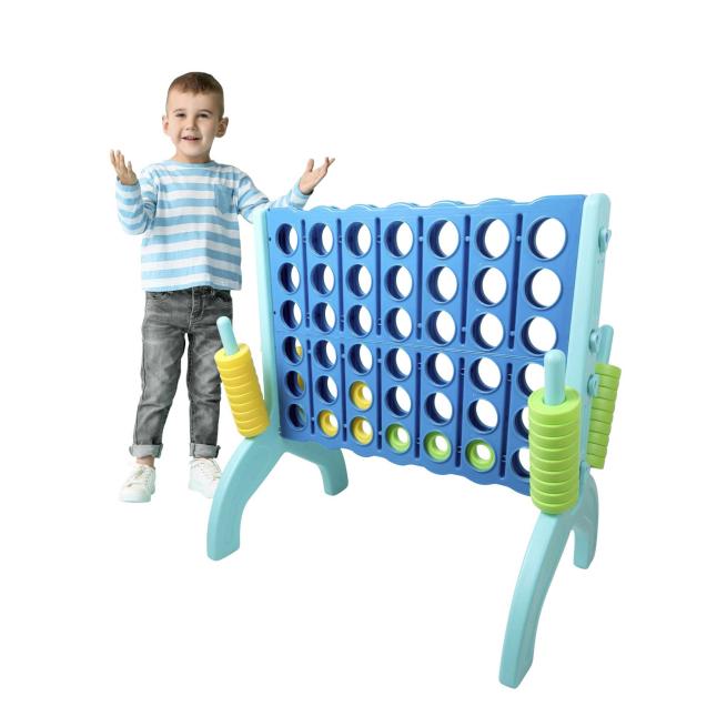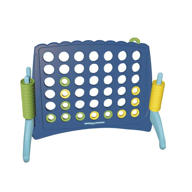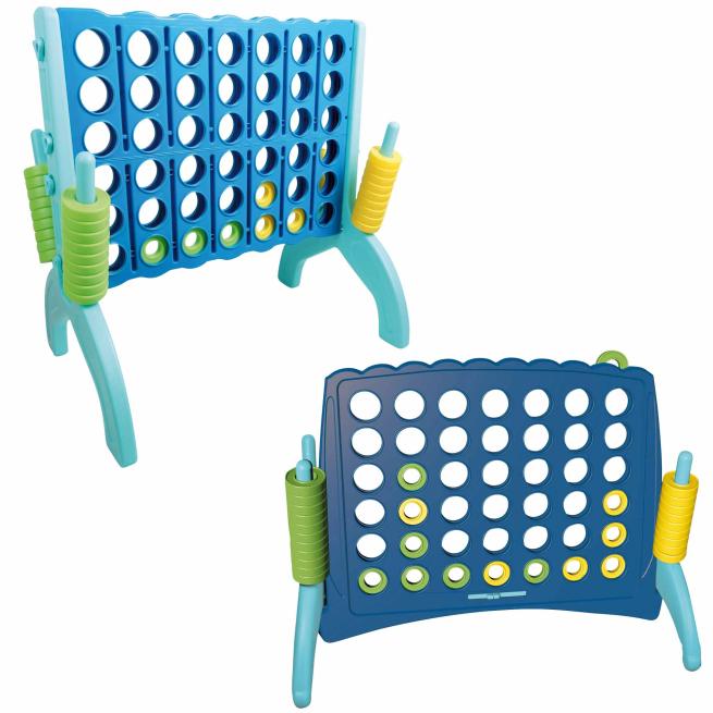 Standfester Spiel-Klassiker für drinnen und draußen. An dem farbenfrohen Gestell taktieren zwei oder mehr Mitspieler die richtige Strategie zum Platzieren der Ringe, sodass vier Ringe derselben Farbe eine waagrechte, senkrechte oder diagonale Reihe ergeben. Platzsparende Aufbewahrung der Spielringe auf den seitlichen vier Füßen.