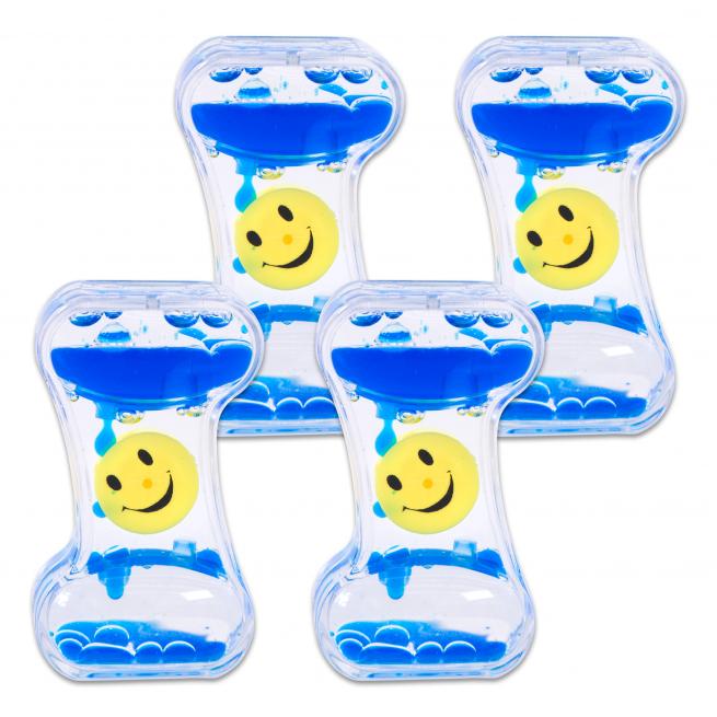 Die Lachgesichter-Wasserspiele funktionieren wie eine Sanduhr, nur flüssig. Dreht man die Sanduhr, läuft die blaue Flüssigkeit langsam nach unten, wodurch sich das Lachgesicht lustig dreht. Für Kinder ist das faszinierend zu beobachten und entspannend zugleich. Außerdem gibt es ihnen ein erstes Gefühl für den Verlauf der Zeit. Auch ideal als kleines Geschenk. Die Durchlaufzeit beträgt ca. 25 Sekunden.