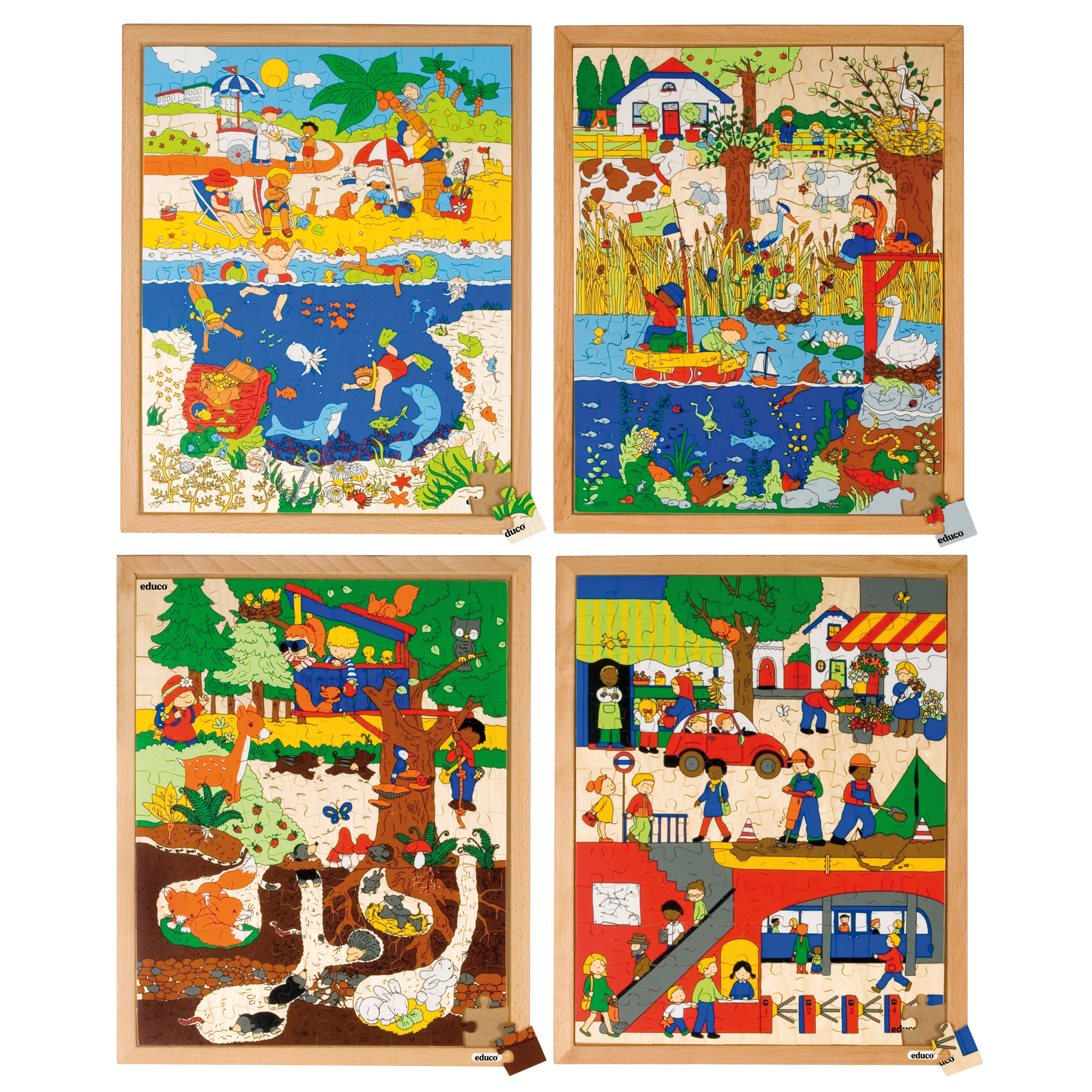 Diese Puzzles sind nicht nur unterhaltsam, sondern auch lehrreich. Entdecke die faszinierende Welt über und unter der Erde und dem Wasser mit unseren spannenden Puzzles! Mit jeweils 120 Teilen bieten diese Puzzles eine Herausforderung für geübte Puzzle-Fans und garantieren stundenlangen Spielspaß. Tauche ein in die Tiefen des Ozeans und entdecke exotische Meeresbewohner, erkunde die Ruhe eines malerischen Sees, durchstreife den dichten Wald oder erkunde das geschäftige Treiben einer Stadt - die Möglichkeiten sind endlos. Die hochwertigen Holzrahmen der Puzzles sorgen nicht nur für Stabilität, sondern verleihen ihnen auch eine ansprechende Optik. Mit einer Größe von 40 x 50 cm bieten sie ausreichend Platz, um jedes Detail zu betrachten und das Puzzle zu einem echten Kunstwerk zu machen. Kinder können spielerisch lernen, welche Tiere und Pflanzen in den verschiedenen Lebensräumen vorkommen und wie sie miteinander interagieren. Gleichzeitig fördern sie die Feinmotorik, Konzentration und Problemlösungsfähigkeiten der kleinen Puzzle-Enthusiasten.