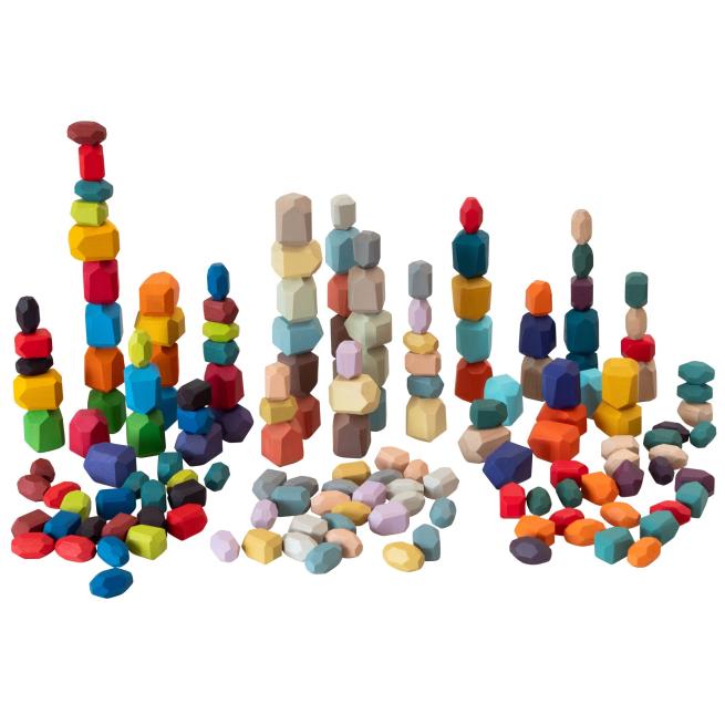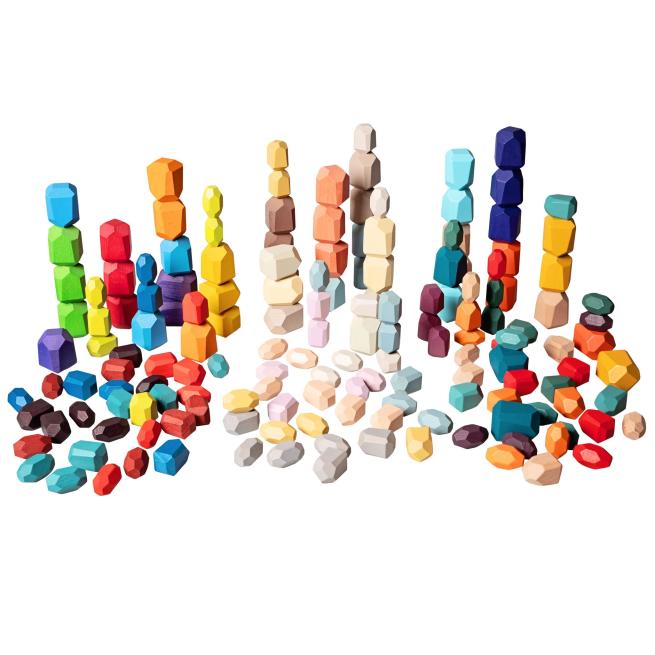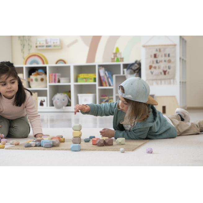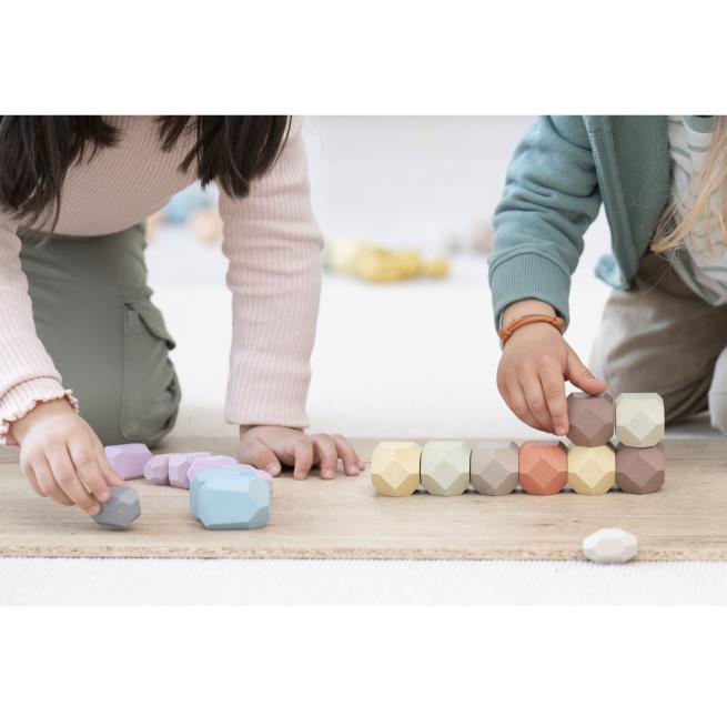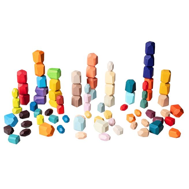 Die polygonale Form der Holz-Edelsteine motiviert Kinder sofort zum Stapeln bzw. Turmbauen. Super, um die taktile Wahrnehmung zu trainieren.