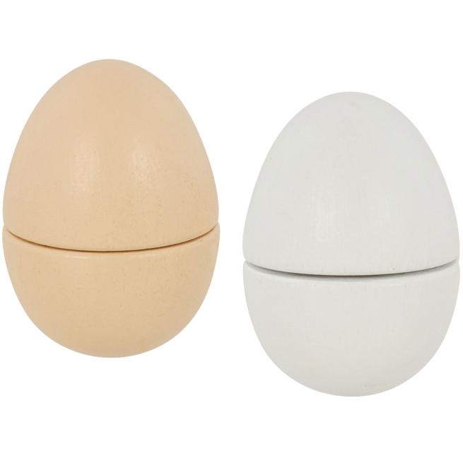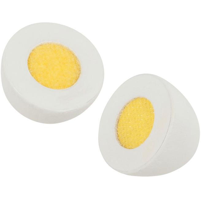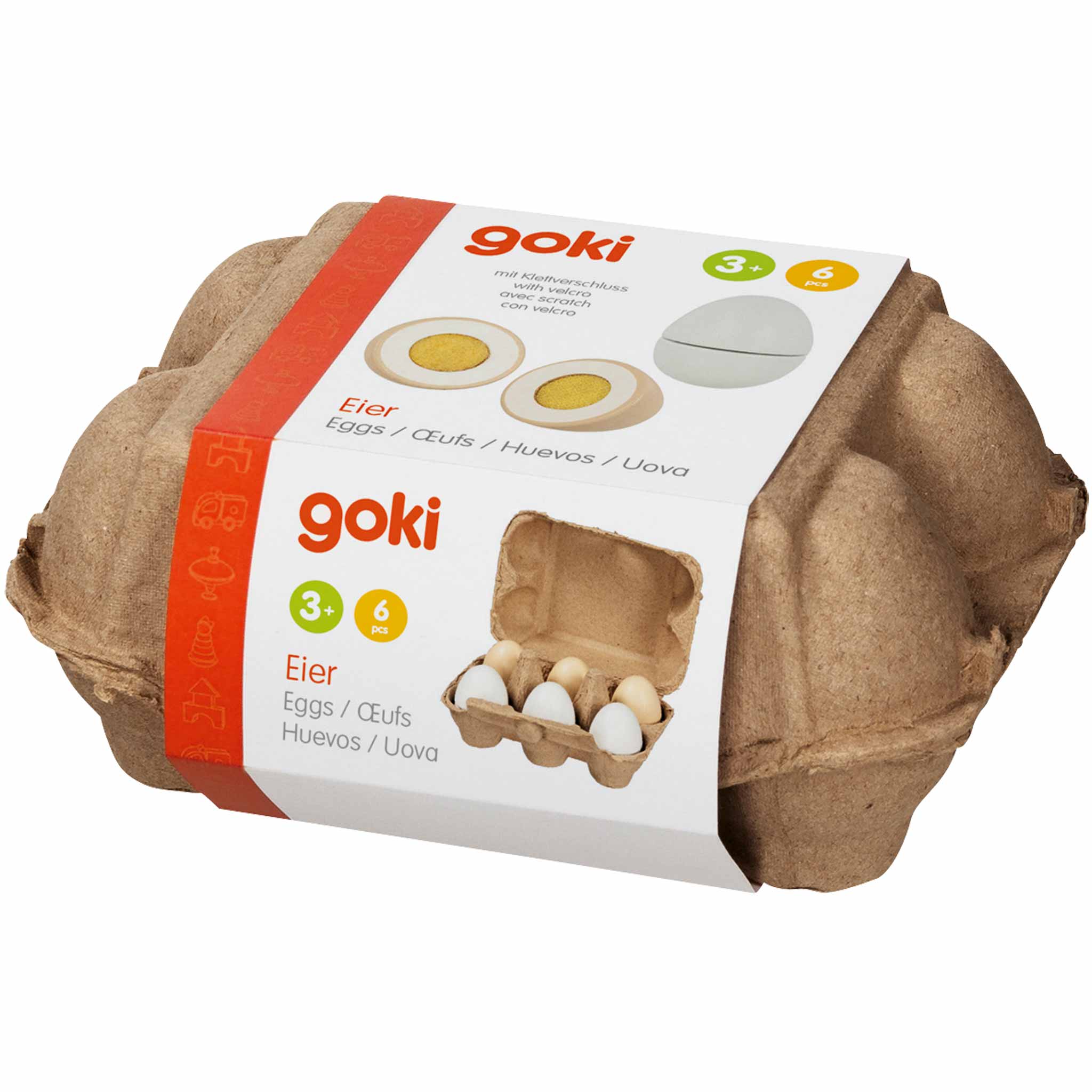 Na toll, in der Kinderküche fehlen Eier. Gut, dass der Kaufladen gleich um die Ecke ist und gerade welche bekommen hat! Im typischen Eierkarton sind 6 Holz-Eier enthalten, 3 davon können die Kinder öffnen, um das Eigelb herauszunehmen.