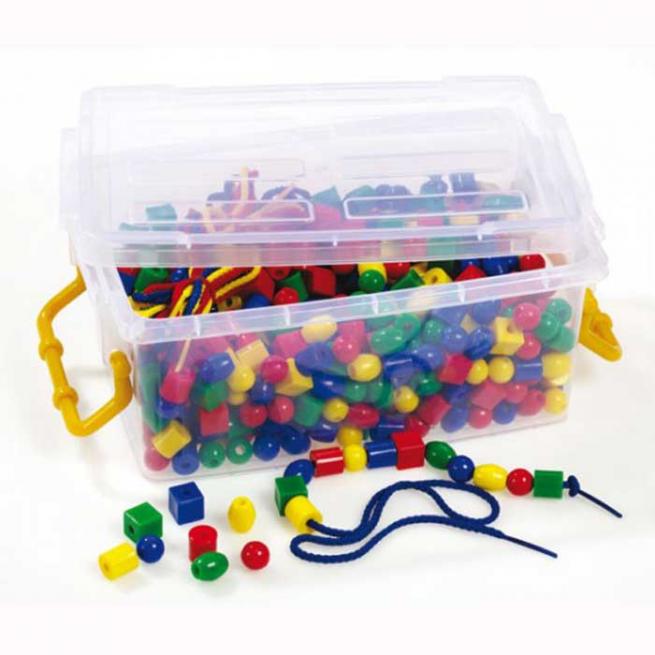 650 Perlen, gemischt in 4 Farben und Formen, ca. 2 cm groß, in einer transaparenten Box mit 6 Fädelschnüren (100% Polyester).