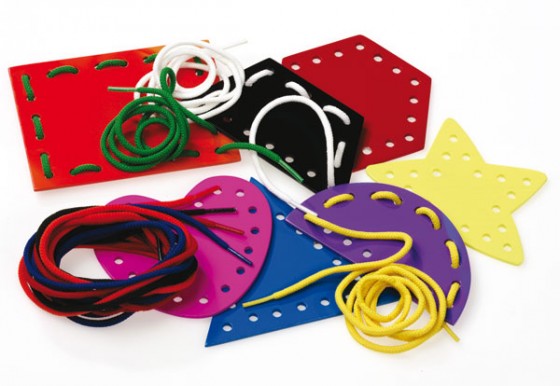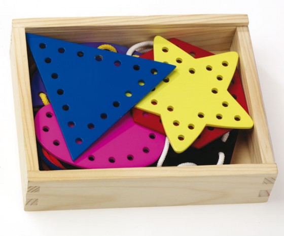Dieses Set enthält 7 geometrische Formen aus Holz zum Fädeln.