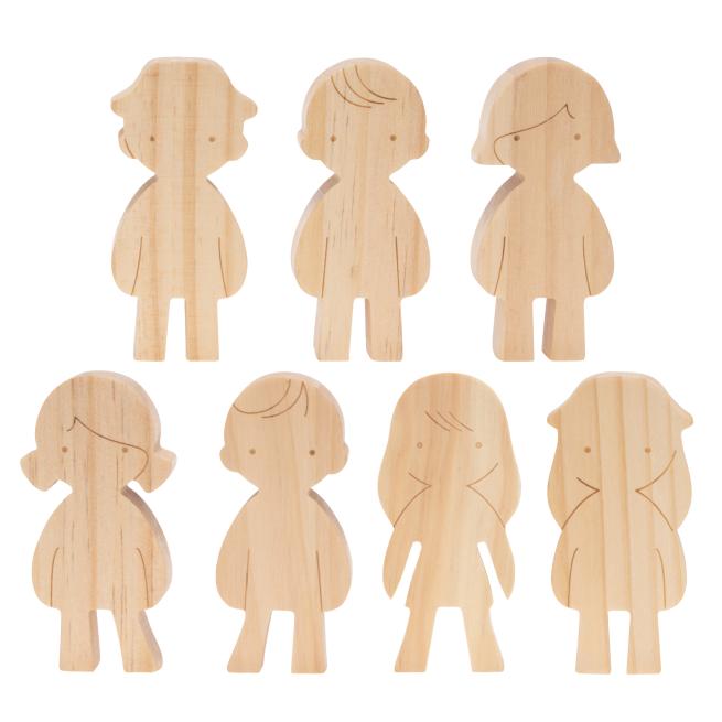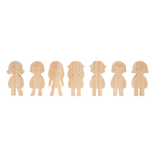 Set aus 7 kleinen und einfühlsam geformten Holzfiguren (H x B x T: 10 x 5 x 1,5 cm), naturbelassen und zum individuellen Bemalen. Die Figürchen sind feingeschliffen und für Kinderhände gut zu greifen, haben einen festen Stand und lassen sich sicher aufstellen. Sie besitzen eine je eigene, liebevolle Gestalt mit individuellen optischen Eigenschaften, sodass keine Figur gleich aussieht.